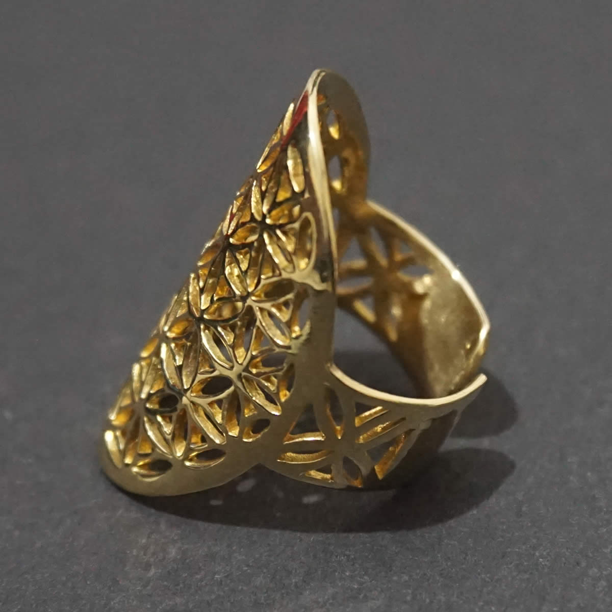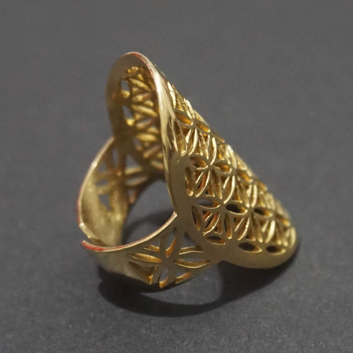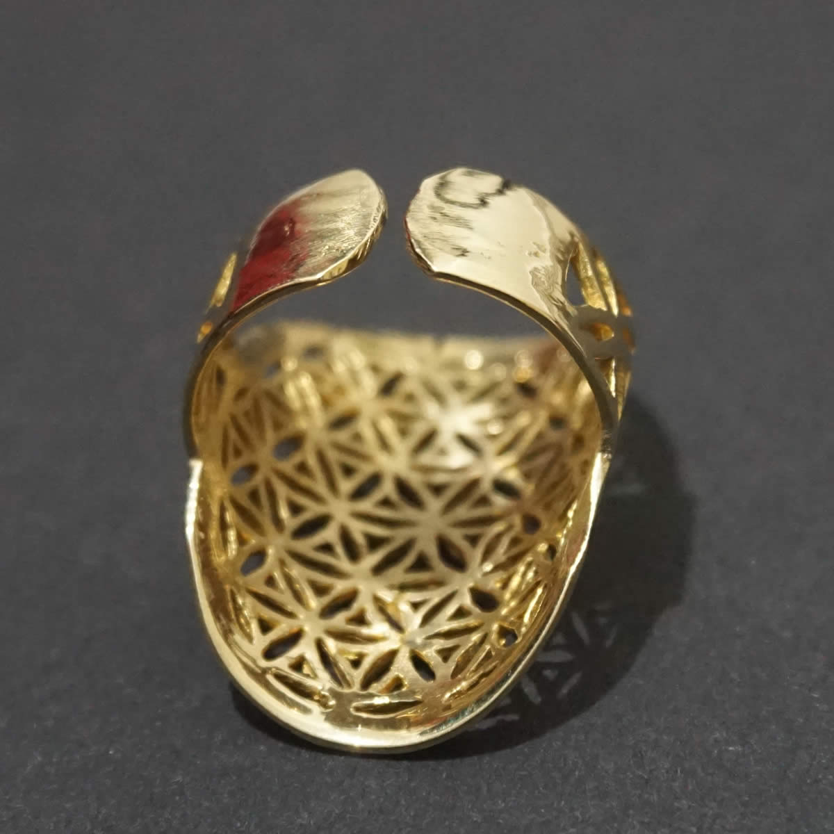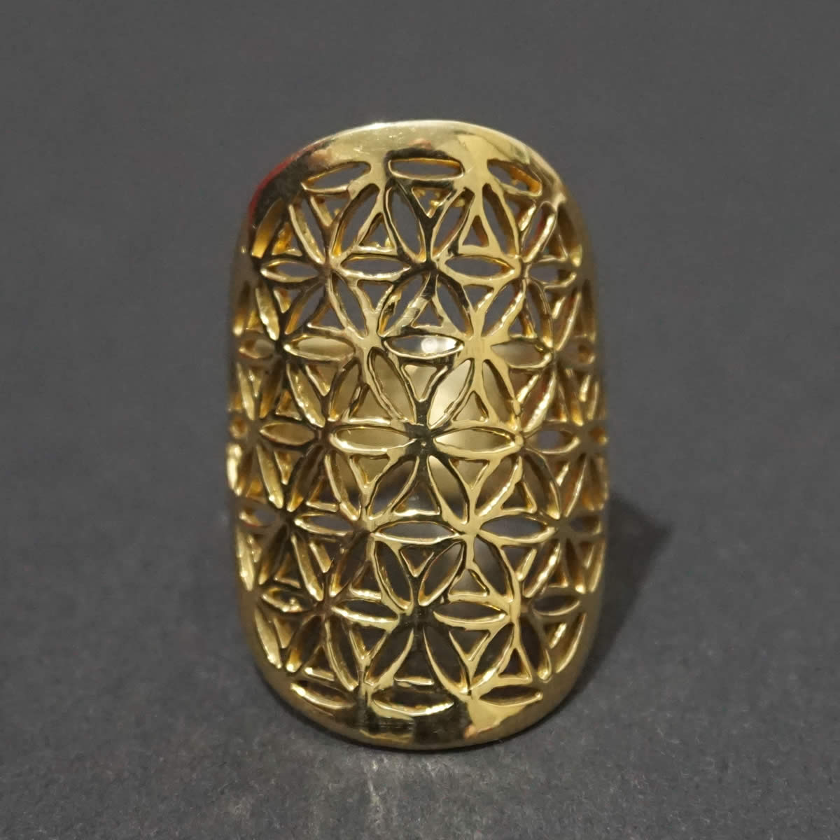 Flower of Life ring hand crafted in nickel free brass with a pattern inspired by the sacred geometry flower of life design. This unisex ring has a wide 20mm patterned face, a patterned shank and features an open back adjustable to fit finger sizes from 20mm diameter..